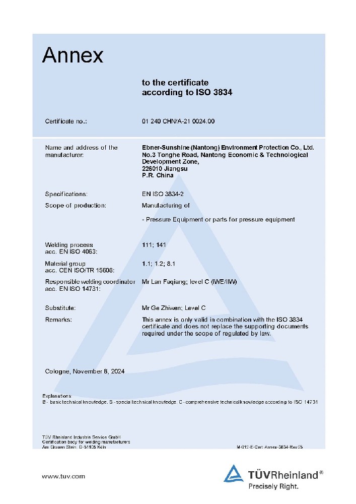 艾伯納三圣(南通)環(huán)保有限公司,成立于2011年,由享有“歐洲蒸發(fā)結晶之父”美譽(yù)的德國百年企業(yè)艾伯納(EBNER)公司和三圣石墨科技強強聯(lián)合。公司致力于為化纖、航空、化工、醫藥、食品等諸多行業(yè)提供各種非標及壓力容器、蒸發(fā)結晶裝置、自動(dòng)化過(guò)濾/增稠/洗滌/干燥裝置、余熱回收裝置、金屬及鹽回收、廢水零排放等產(chǎn)品和成套環(huán)保節能技術(shù)裝備。我們擁有:◆ ASME認證◆ 壓力容器制造許可證◆ EN ISO3...